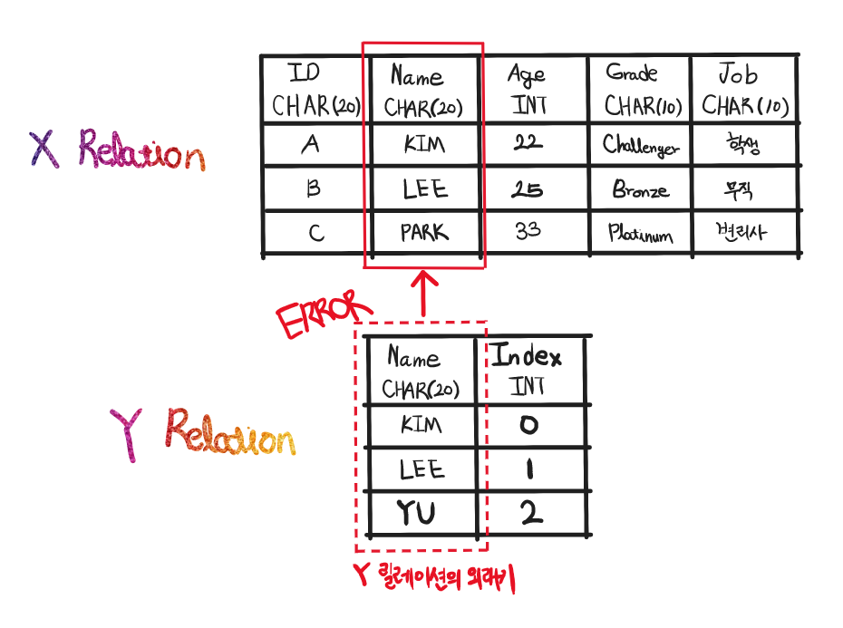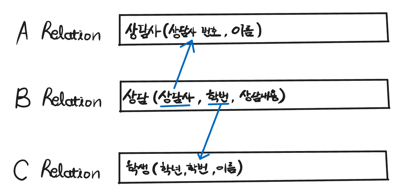 외래키가 자신이 참조하는 릴레이션의 기본키와 상관 없는 값을 갖게 되면 두 릴레이션을 연관시킬 수 없으며, 두 릴레이션을 연관시켜주는 외래키 본래의 의미를 잃게 됩니다.