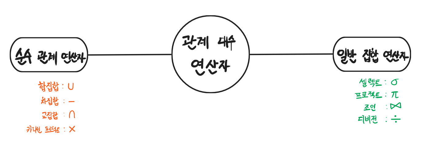관계 대수에 속하는 대표적인 연산자 8개는 특성에 따라 순수 관계 연산자(Relational Operation), 일반 집합 연산자(Set Operation)로 나눌 수 있습니다.