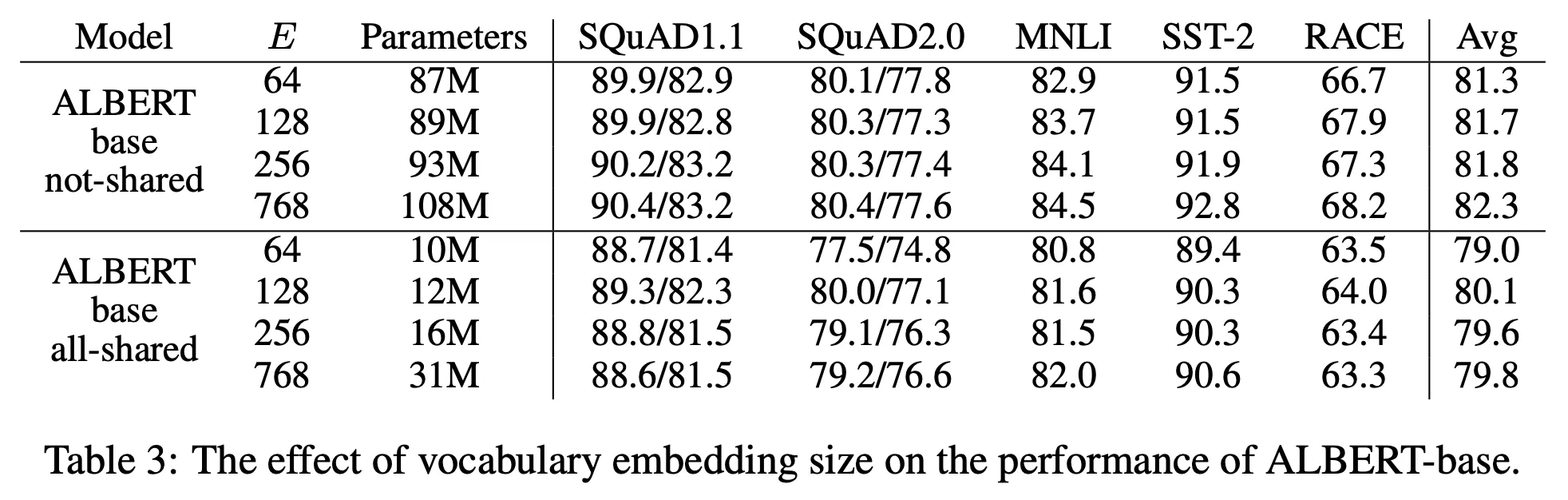 - ALBERT-xxlarge는 BERT-large보다 파라미터는 70% 수준이지만 성능은 크게 향상